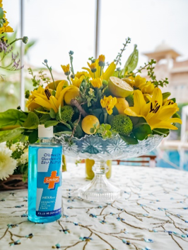 As for sanitizing, install hand wash or sanitizer stations at the entrance and near the dining area matching with the theme of the event. You can even put together delightful little care packages that have mini sanitizer bottles, masks, and some other wedding favors.