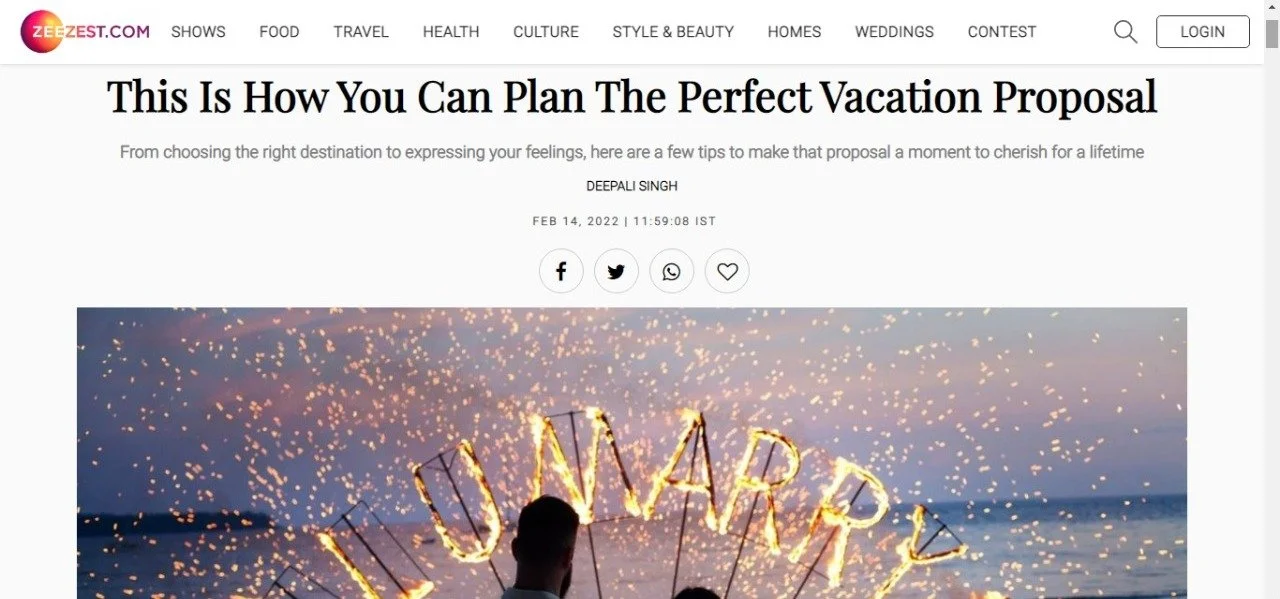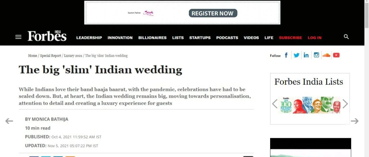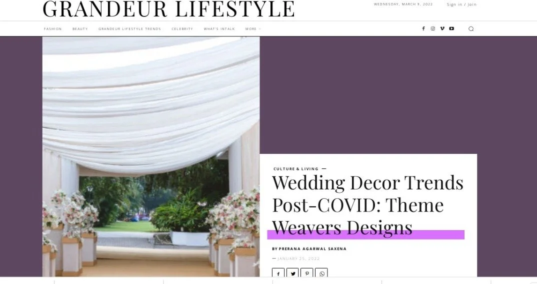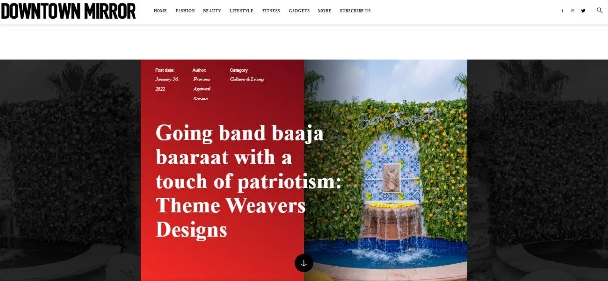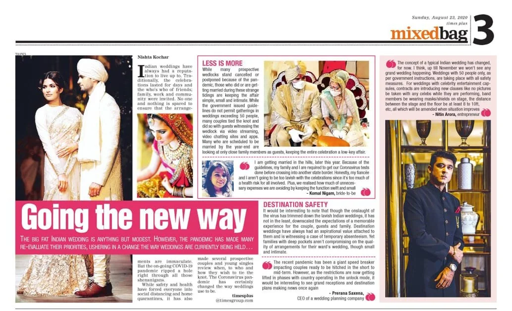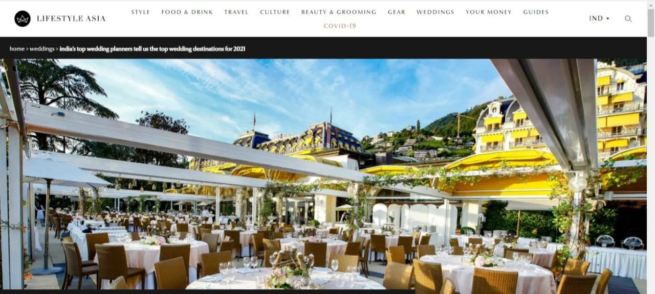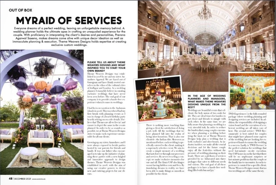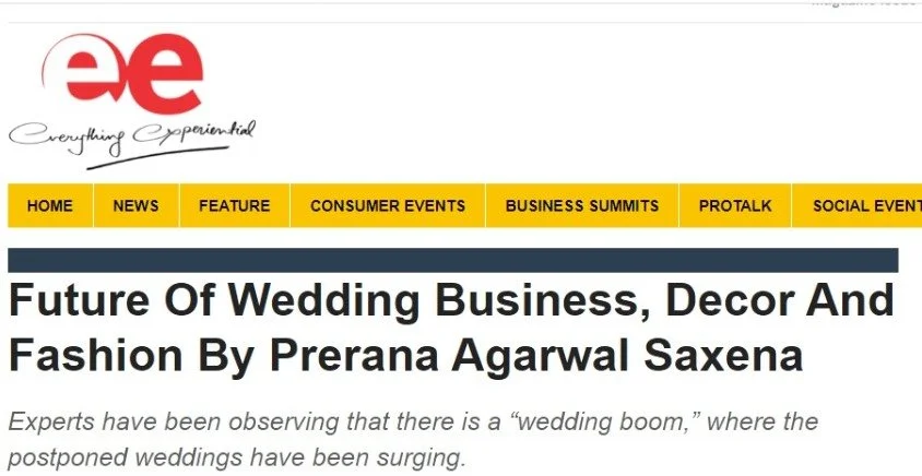 MEDIA & AWARDSINDIA’S TOP PLANNERS FOR DESTINATION & PALACE WEDDINGSDIGITAL Epic Luxury Weddings: Interview Business World Indian Down Under The Economic Times Zee Zest Downtown Mirror Pinkvilla The New Indian Express Telegraph India Women Entrepreneur India Everything Experiential BW Hotelier Indian Express : INDULGE Grazia Lifestyle Asia Forbes Peacock Magazine YourStory Wedding Wire Everything Experiential Times Of India Business World Hotelier India Hotelier India Ivory Station Wedding Wire Times Of India The Pioneer India Everything Experiential Grandeur Lifestyle Times Of India Lifestyle Asia Business World Femina Outlook Traveller Indiatoday Home TV PRINT She India Wedding Stories View fullsize The Economic Times Telegraph India View fullsize Indulge New Indian Express View fullsize G Society Magazine View fullsize Times Of India Marwar India View fullsize Femina Wedding Times View fullsize Greh Lakashmi Magazine The Sunday Standard Magazine LIKE WHAT YOU SEE? For More Information, CONTACT US