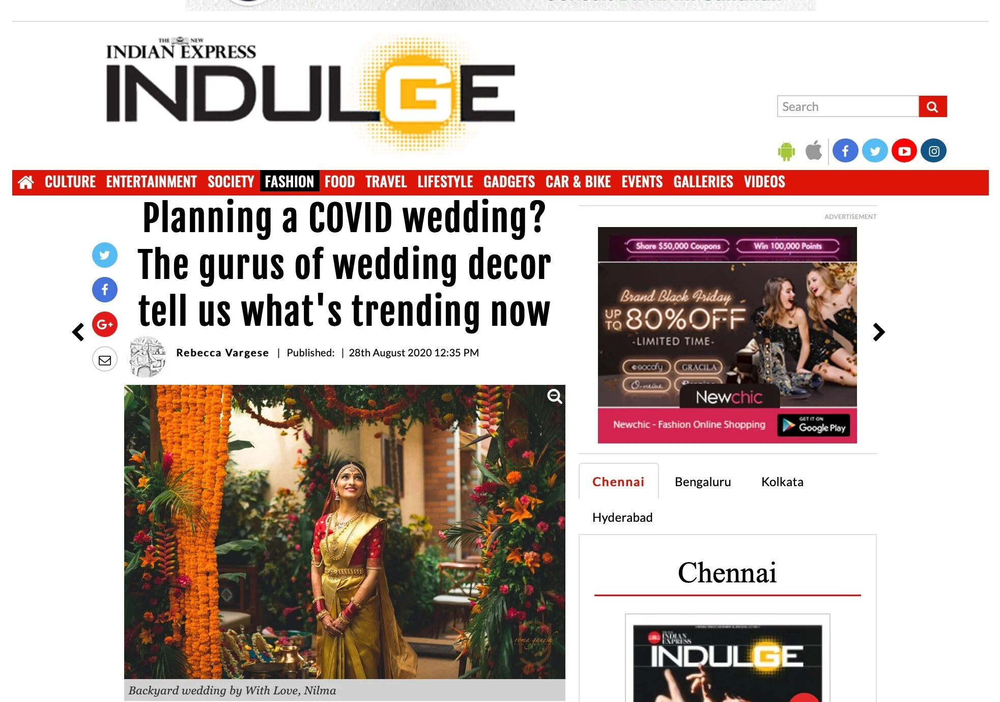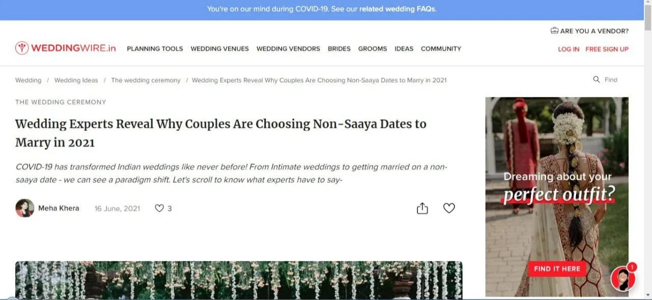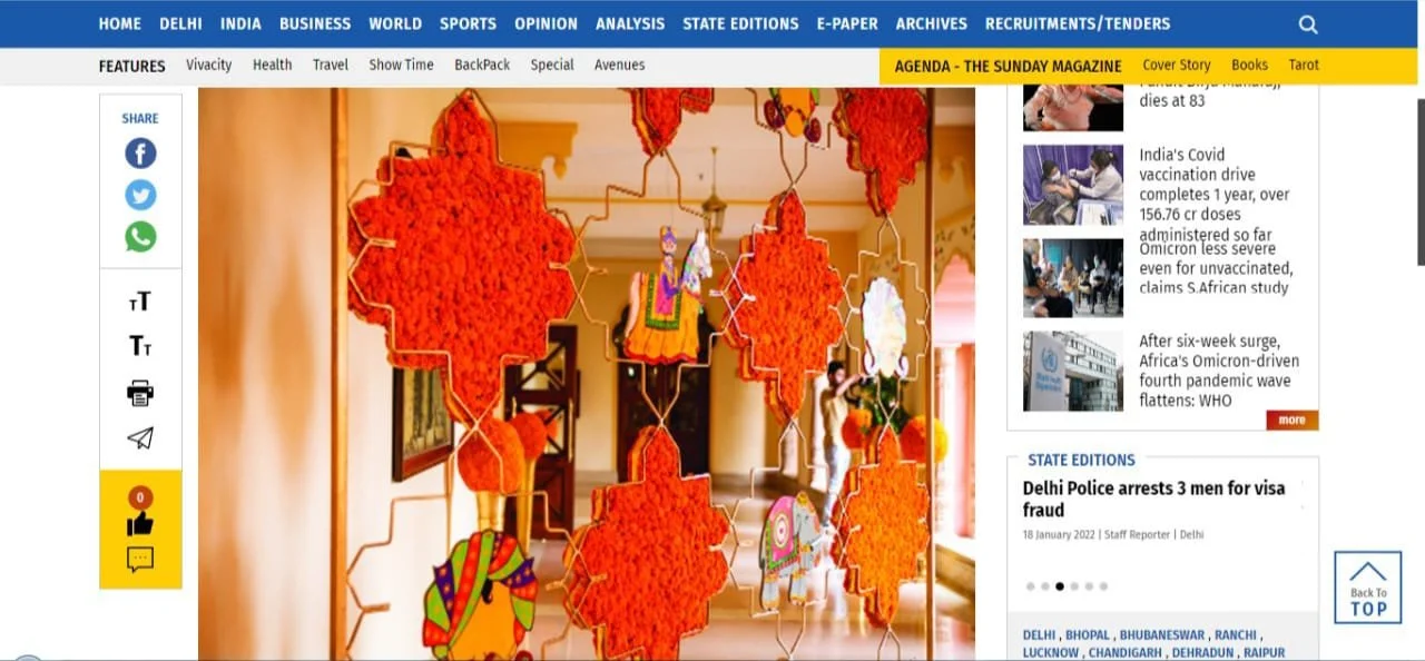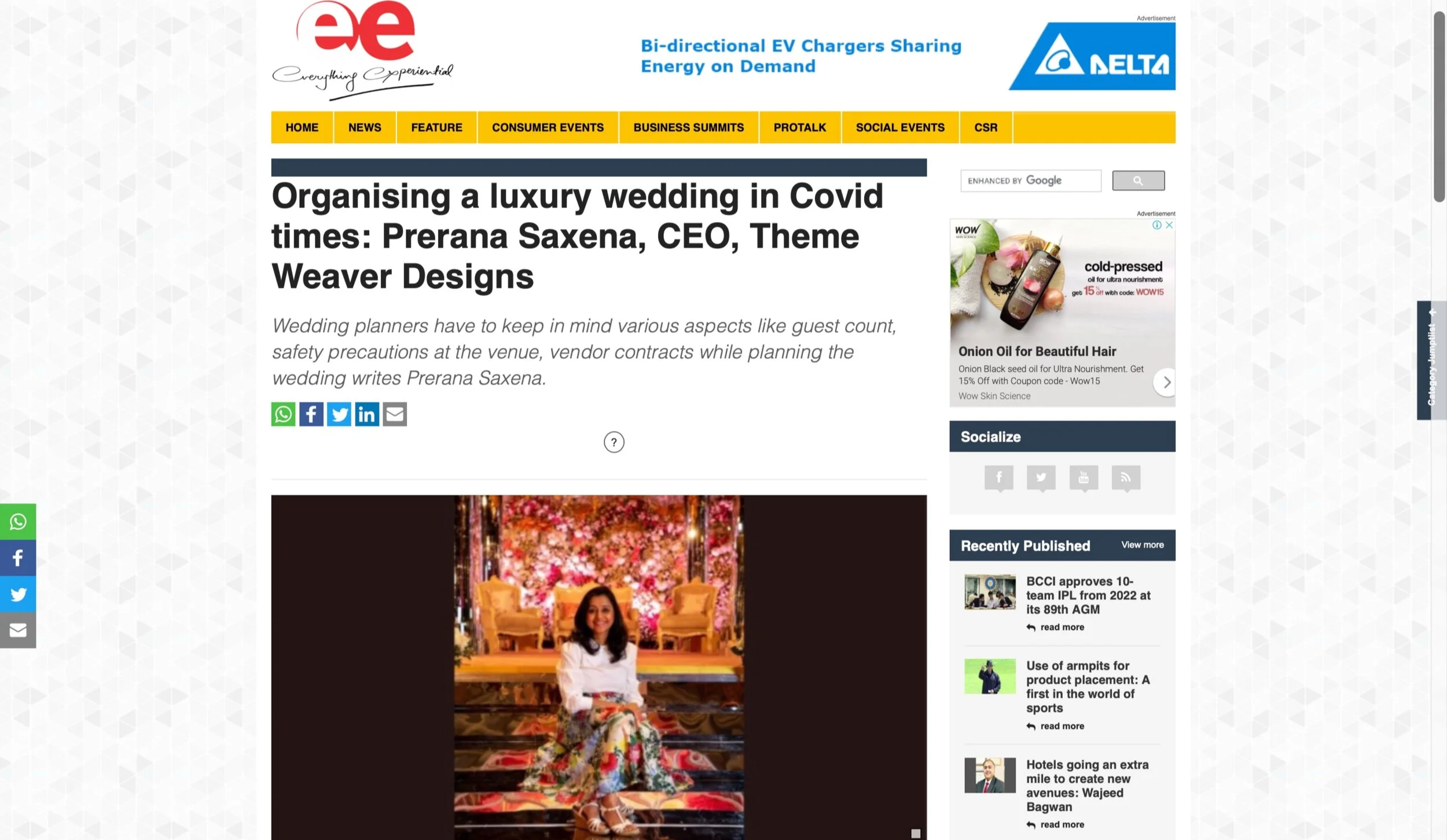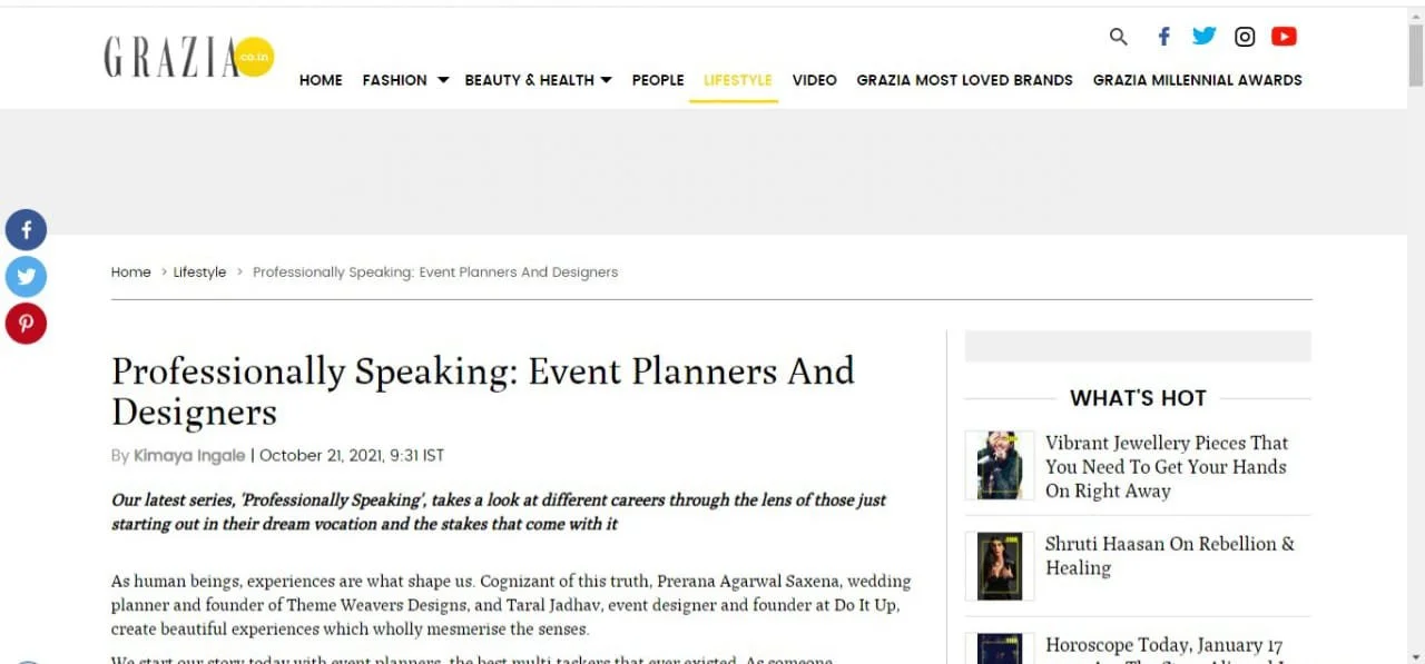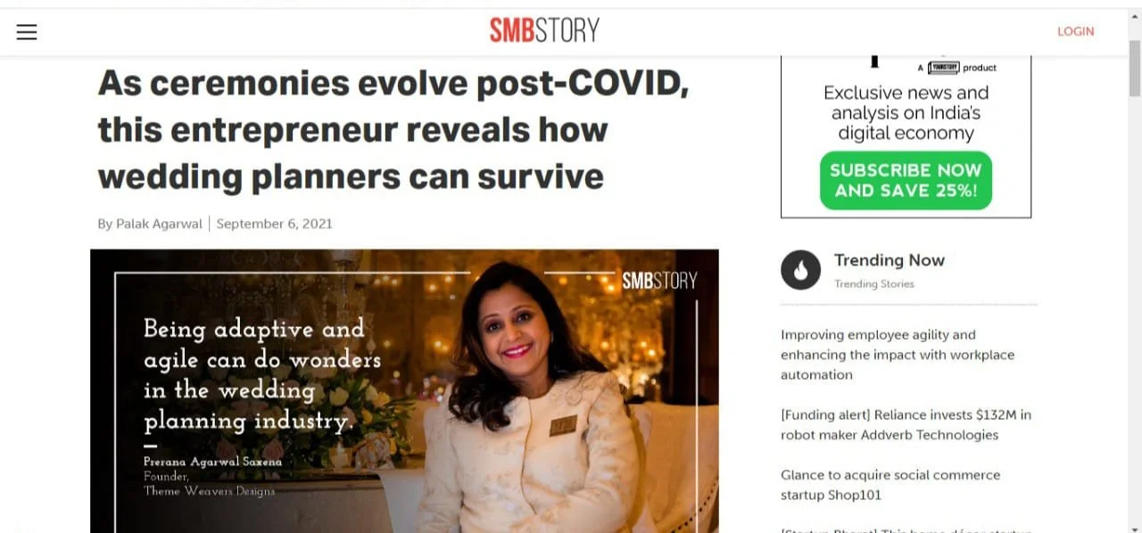 MEDIA & AWARDSINDIA’S TOP PLANNERS FOR DESTINATION & PALACE WEDDINGSDIGITAL Epic Luxury Weddings: Interview Business World Indian Down Under The Economic Times Zee Zest Downtown Mirror Pinkvilla The New Indian Express Telegraph India Women Entrepreneur India Everything Experiential BW Hotelier Indian Express : INDULGE Grazia Lifestyle Asia Forbes Peacock Magazine YourStory Wedding Wire Everything Experiential Times Of India Business World Hotelier India Hotelier India Ivory Station Wedding Wire Times Of India The Pioneer India Everything Experiential Grandeur Lifestyle Times Of India Lifestyle Asia Business World Femina Outlook Traveller Indiatoday Home TV PRINT She India Wedding Stories View fullsize The Economic Times Telegraph India View fullsize Indulge New Indian Express View fullsize G Society Magazine View fullsize Times Of India Marwar India View fullsize Femina Wedding Times View fullsize Greh Lakashmi Magazine The Sunday Standard Magazine LIKE WHAT YOU SEE? For More Information, CONTACT US